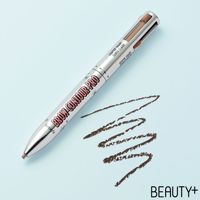 베네피트 브로우 컨투어 프로 #1 블론드 똑딱이 볼펜을 빼닮은 위트 넘치는 패키지와 다양한 기능에 반했다. 흐릿한 눈썹의 틀을 잡는 두 가지 컬러의 브로우 펜슬과 윤곽을 살리는 디파이너, 하이라이터로 구성돼 있는데 눈썹앞머리엔 밝은 컬러를, 눈썹꼬리에는 어두운 컬러를 사용하고 눈썹의 모양을 잡아주는 것만으로도 완성도 높은 4D 눈썹을 연출할 수 있다. 각 0.1g×4 4만4000원.