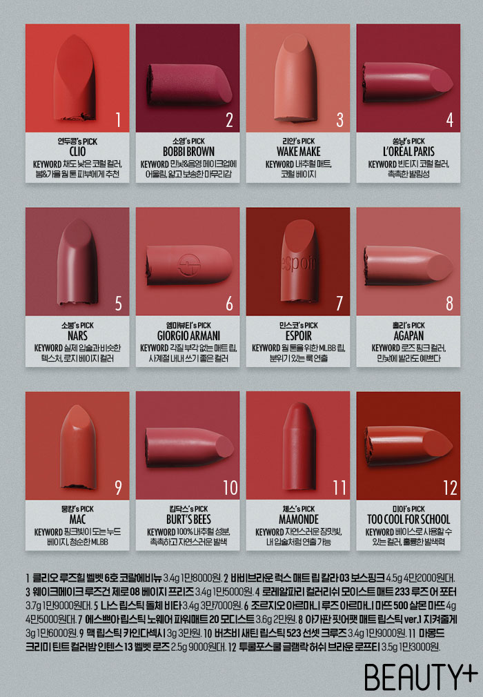 날씨가 서늘해지기 시작하면 MLBB 컬러가 눈에 띄게 쏟아져 나온다. 브라운이 섞인 차분한 톤 때문에 F/W 시즌 유행하는 음영 메이크업이나 뉴트럴 컬러의 의상과 어울리기 때문. MLBB 컬러가 이슈로 떠오른 건 단지 이런 계절적인 요인 때문만은 아니다. 말린 장미 립 열풍의 중심에는 SNS 스타 릴리 메이맥과 모델이자 배우인 할리우드 스타 카일리 제너가 존재한다. 그녀들이 즐겨 바르는 톤 다운된 브릭 컬러나 베이지 핑크 컬러 립스틱이 SNS를 타고 전 세계적으로 유행했고, 뒤이어 수많은 뷰티 브랜드들도 앞다투어 MLBB 컬렉션을 출시했다. 최근 아모레퍼시픽에서 대대적으로 선보인 ‘컬러 어떰(Color Autumn)’ 컬렉션 역시 ‘으깬 장미’의 색을 표현한 MLBB 컬러들로 구성돼 있다. 이렇듯 MLBB는 현재 립 메이크업 시장의 가장 핵심적인 트렌드로 우뚝 서 있다. 아니, 이제 트렌드를 넘어 ‘레드 립’과 같은 하나의 카테고리가 됐다고 봐도 무방하다. 누구보다 트렌디한 뷰티 크리에이터들 역시 MLBB 립 컬러를 즐긴다. 민낯에 사용해도 자연스러울 뿐만 아니라, 뉴트럴 계열의 립 컬러가 진한 아이 메이크업과 조화를 이루기 때문에 뷰티 크리에이터들 사이에서 인생 MLBB 립스틱은 하나씩 존재한다. 우리가 MLBB 립스틱을 구입하려고 할 때 이들의 선택을 참고하면 실패할 확률이 적다. 의외로 MLBB 립 컬러는 비슷한 듯 비슷하지 않은 컬러들이라 어떤 컬러를 선택해야 할지 감이 오지 않는데, 평소 나의 메이크업 스타일과 비슷하거나 피부톤이 유사한 뷰티 크리에이터가 사용하는 MLBB 립스틱이라면 좋은 가이드가 되어줄 거다. 뷰티 크리에이터 12인이 꼽은 #인생MLBB 립 컬러를 참고해 올가을 고혹적인 장밋빛 입술로 변신해보자.