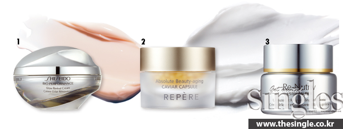 1 시세이도 바이오 퍼포먼스 글로우 리바이벌 크림 피부 결점과 주름, 거친 피부와 홍조, 모공을 개선해 피부에 젊은 에너지를 충전시킨다. 또한 수 바이오-히알루론산 플러스 효과를 겸비해 24시간 동안 촉촉한 피부가 유지된다. 50ml 15만원.