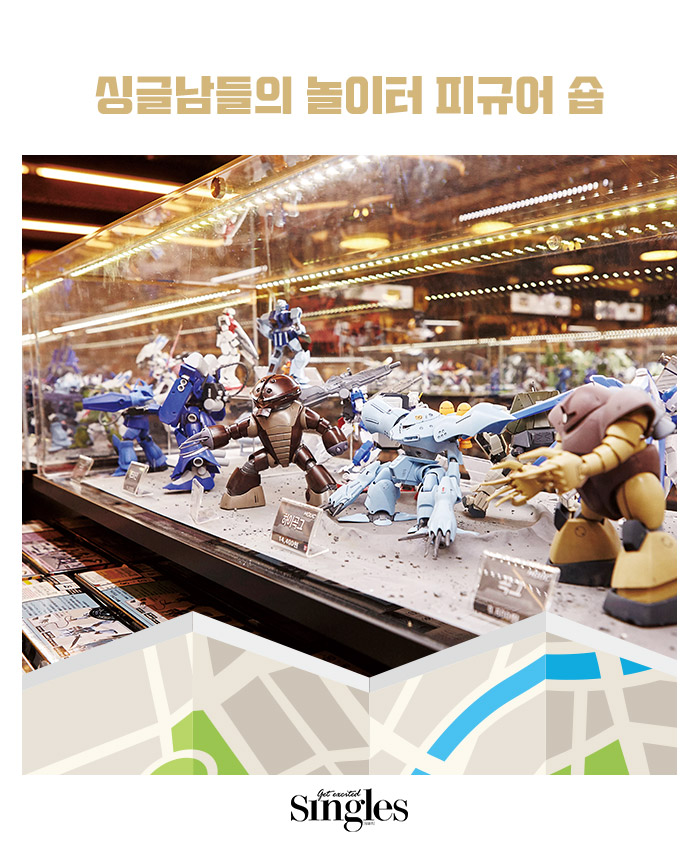 배우 심형탁을 보며 건장하고 섹시한 싱글남이 장난감과 캐릭터에 열광할 수도 있다는 사실을 새롭게 깨달은 싱글이라면, 외골수 싱글남의 놀이터인 피규어 숍을 눈여겨봐야 한다. 피규어 좋아하는 남자들 중 상당수는 술 안 마시고 허튼짓 안 하는 ‘바른 생활 사나이’다. 왜냐하면 그들의 관심사는 오직 피규어뿐이기 때문이다. 이런 남자를 만나면 적어도 바람 피울 걱정은 안 해도 되지 않을까. 물론 위험 부담은 있다. 애인인 내가 언제나 피규어보다 우선순위에서 밀리는 굴욕을 맛봐야 할지도 모르니까. 피규어 숍에는 평일과 주말 할 것 없이 싱글남들의 발길이 끊이질 않는다. 직장인들은 점심을 먹은 후 테이크아웃 커피를 들고 한 번 쓱 훑어본 다음 퇴근 후 마음에 드는 피규어를 구매하는 편이라고 한다.