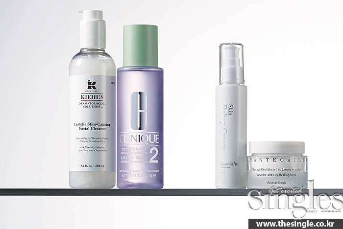 (왼쪽부터) 키엘 센텔라 스킨 카밍 훼이셜 클렌저 200ml 4만원, 크리니크 클래리파잉 로션 투와이스 어 데이 엑스폴리에이터 200ml 3만원, 에코유어스킨 스킨 리햅 크림 50ml 6만원, 샹테카이 자스민 앤 릴리 힐링 마스크 50ml 12만1000원.