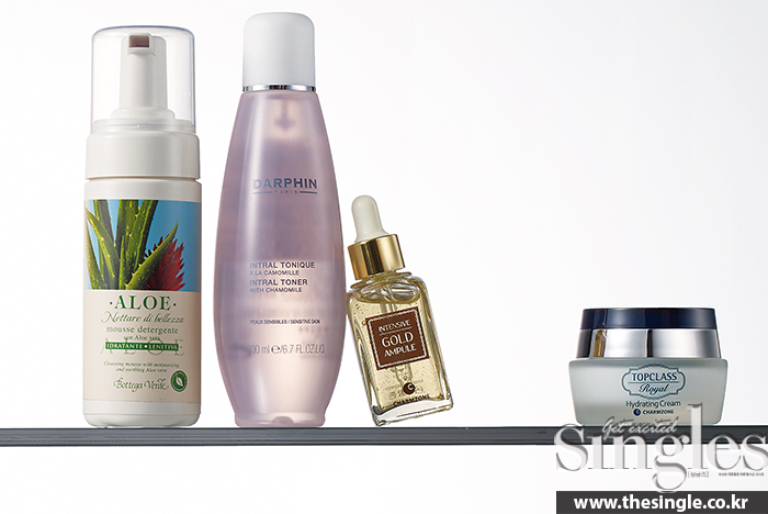 (왼쪽부터) 보테가 베르데 클렌징 무스 위드 모이스처라이징 앤 수딩 알로에 베라 by 벨포트 100ml 1만2500원, 달팡 인트랄 토너 200ml 6만원, 참존 인텐시브 골드 앰플 30ml 8만원, 참존 탑클래스 로얄 하이드레이팅 크림 50ml 4만5000원.