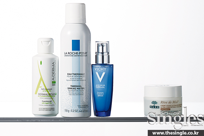 (왼쪽부터) 아더마 더말리부 + 젤 무쌍 125ml 1만8000원, 라로슈포제 오 떼르말 150ml 1만7000원, 비쉬 아쿠알리아 떼르말 30ml 4만5000원대, 눅스 레브드미엘 울트라 컴포터블 나이트 크림 50ml 4만2000원.