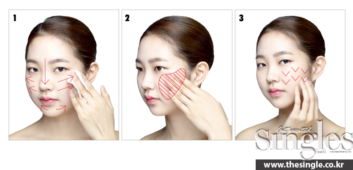피부 표면에 바른 화장품의 유효 성분이 속까지 침투되는 데는 시간이 필요하다. 하나의 제품이 피부 속에 흡수될 시간도 주지 않은 채 계속적으로 화장품을 덧바르다보면 결국 표면에서 서로 뒤엉켜 무엇 하나 제대로 흡수되지 못하는 불상사가 생기고 만다. 제품과 제품 사이에 충분한 여유를 둬 유효 성분이 흡수될 수 있도록 할 것. 짧게는 1분에서 여유가 있다면 3~5분 정도 여유를 두는 것이 좋다. 가정용 초음파기기를 사용해 제품의 흡수를 돕는 것도 좋은 방법이다. 제품과 제품 사이 여유 시간 동안 마사지를 곁들인다면 더할 나위 없이 좋다. 피부가 유연해져 흡수율이 증가될 뿐 아니라, 혈액순환이 활발해지면서 혈색이 좋아져 즉각적으로 피부가 한층 건강해 보이는 효과도 얻을 수 있기 때문. 단, 마사지할 때는 손바닥이 아닌 손가락 전체를 사용하고, 패팅하기 전에 손가락 끝에도 제품을 묻혀 촉촉하게 만든 후 충분히 두드리면 더욱 효과적이다.