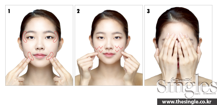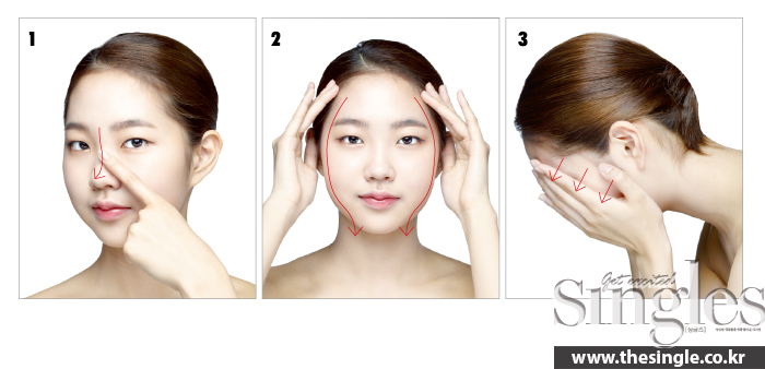 2 엄지와 검지로 양볼을 가볍게 꼬집으면서 지압한다. 정체된 혈액과 림프 순환을 활발하게 해 피부 속에 막힌 물길을 뚫는 효과가 있다.