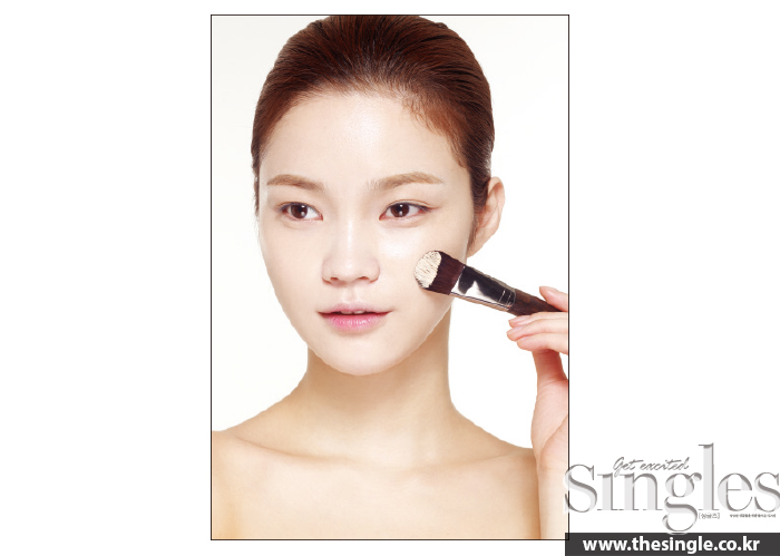브러시를 이용해 매우 얇게 발랐기 때문에 잡티 부위는 여전히 눈에 띌 것이다. 파운데이션과 컨실러를 1:1의 비율로 믹스한 뒤, 스펀지를 이용해 잡티 부위에 얹는 느낌으로 톡톡 두드리며 바른다. 지성 피부라면 T존과 같이 피지가 잘 생기는 부위에도 소량을 꾹꾹 눌러가며 발라 메이크업이 잘 밀착되도록 한다.