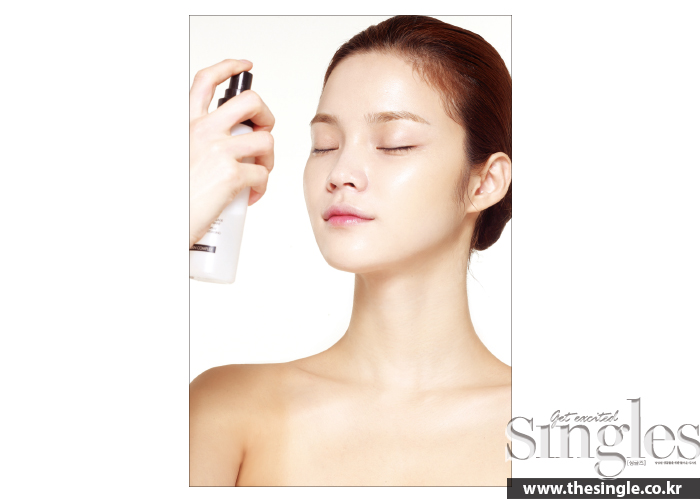 이로써 1차 피부 메이크업은 끝이 났다. 2차 메이크업이 시작되기 전, 피부를 다지는 의미로 픽스 미스트를 딱 한 번만 분사해 얼굴 전체에 얇게 뿌린다. 손바닥으로 두드리지 말고, 그 상태대로 메이크업 위에 코팅막을 씌울 수 있게 방치한다.