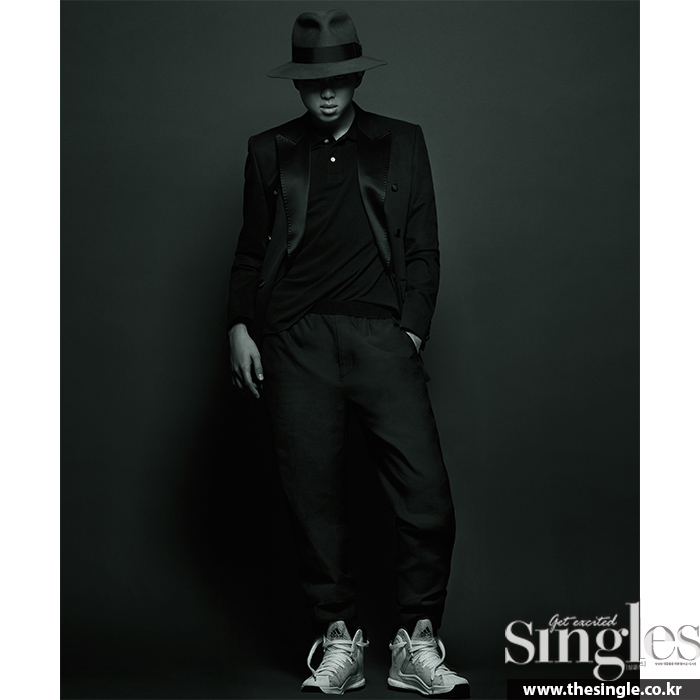 실크 라펠이 더해진 턱시도 재킷은 장광효 카루소 가격미정, 이너 피케 톱은 플레이 꼼데가르송 가격미정, 블랙 조거 팬츠는 우영미 가격미정, 페도라는 볼사리노 by 커드 80만원, 화이트 하이톱 스니커즈는 아디다스 20만9000원.