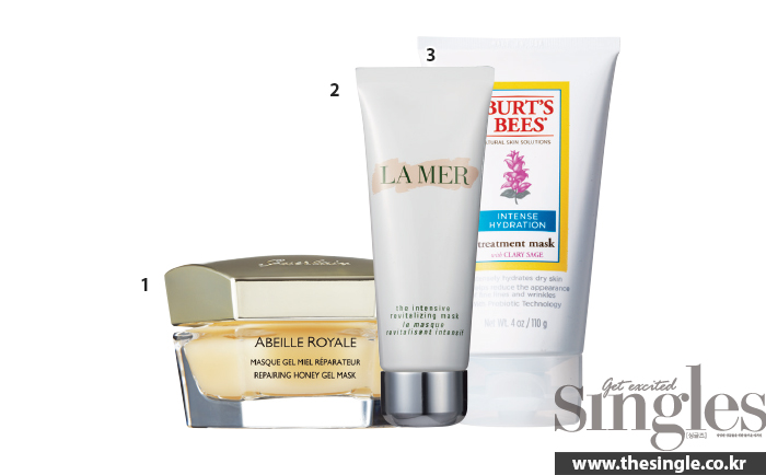 겔랑과 라 메르의 마스크는 흡수시켜도 돼 아침에 활용하기 편하다. 겔랑 젤 마스크의 주요 성분인 위쌍 허니에는 케라틴, 콜라겐의 주요 구성원인 아미노산이 담겨 있어 느슨해진 피부조직을 잡아준다. 라 메르 마스크 역시 생발효시킨 청정 해초 성분이 피부 속부터 수분을 차오르게 해 보습 장벽을 강화시킨다. 8~10분간 마사지를 곁들이길 추천. 즉시 피부 질감이 말캉해지는 게 유수분 밸런스가 최적의 상태임을 느낄 수 있다. 보습에 특화된 클라리 세이지 및 각종 버터 성분을 함유한 버츠비의 마스크는 극건성 피부 타입에 추천한다.