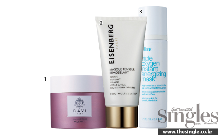 바르면 즉시 샴페인 같은 거품이 형성되는 블리스의 마스크. 산소가 피부 깊숙이 전달되게 하는 EUK-134시스템에 의해 피부 속에서 저하된 산소 농도를 높여줌으로써 피부 속에 쌓인 독소를 제거해 얼굴에 생기를 더한다. 아이젠버그의 마스크는 캡슐화된 비타민 A, E가 활성산소를 억제해 노화를 방지하며 세포 재생에 탁월한 트리오 멀레큘러 포뮬라가 처진 얼굴선을 정리한다. 다비의 마스크 역시 강력한 항산화 효능이 특징. 유효 성분이 풍부한 포도씨 오일 추출물과 포도 껍질을 그대로 담았다. 처진 선을 끌어올리듯 바르면 좋다.