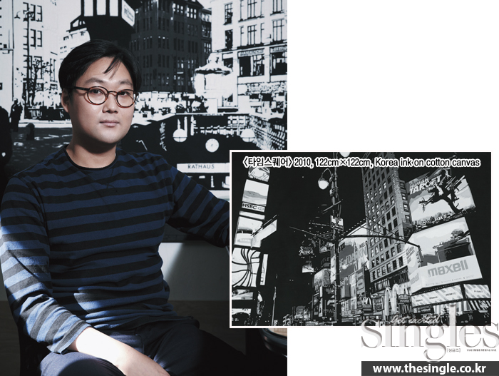 홍익대학교에서 동양화를 공부하고 박사과정까지 마친 그였지만 자신의 색을 갖기까지는 다시 시간이 필요했다. 전통 동양화의 벽에 부딪히자 자신을 돌아보기 시작했다. 그렇게 나온 답은 먹과 자동차, 현대도시, 직선 정도였다. 전통적인 회화 방식의 수묵이 최첨단을 보여주는 도시 풍경과 역시 문명의 이기이자 기술의 집약체인 자동차와 만나는 모습에 사람들은 먼저 당황한다. 세밀하게 조율되고 정제된 흑백의 이미지가 사진이 아닌 그림이라는 사실을 알게 되면 다시 경쾌한 탄성을 뱉는다.