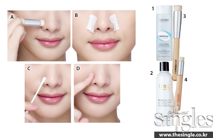 B 토너를 충분히 적신 화장솜을 콧방울 부분에 올려 충분히 수분을 공급한다.