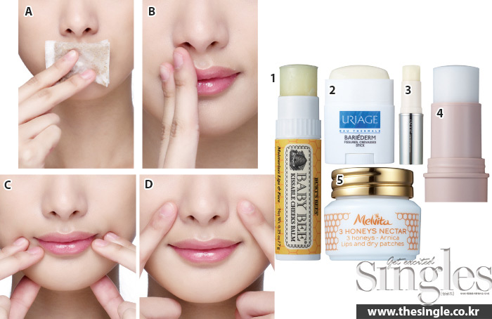 B 입술 전체에 3분간 보습 크림을 도포한 뒤 적당량만 남기고 깨끗한 물티슈로 닦아낸다.