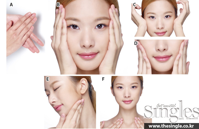 B 데워진 양손바닥으로 양볼을 부드럽게 감싼 후 지그시 누른다.