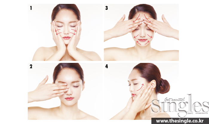 1 세럼을 얼굴 전체에 펴 바른 뒤 양볼을 감싸고 바깥쪽으로 밀어내며 흡수시킨다.