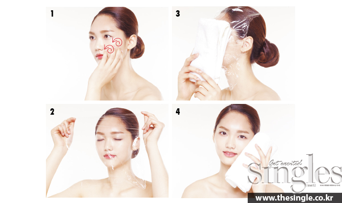 4 랩을 벗긴 후 물기를 적신 스팀타월로 얼굴 안쪽에서 바깥쪽으로 닦아낸다.