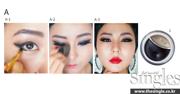 A-1 고양이 눈매의 아이라인은 눈꼬리를 과장되게 올려 그리는 것이 포인트. 언더라인까지 블랙으로 진하게 그려야 치타 메이크업의 매력이 살아난다.