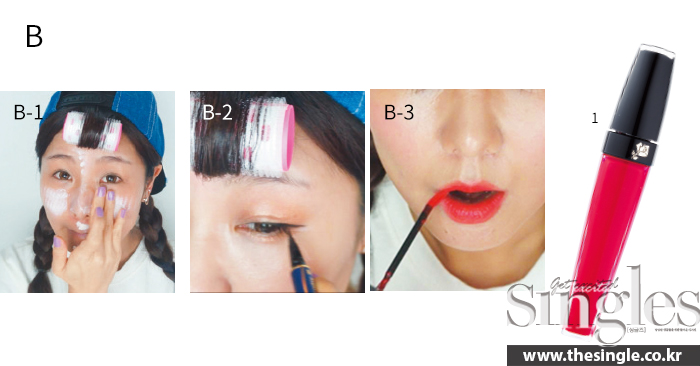 B-3 발랄한 느낌을 살리기 위해 립 전체에 오렌지 컬러를 바른 뒤, 좀더 선명한 레드 컬러를 입술 안쪽에 발라 그러데이션한다.