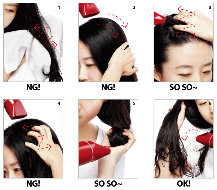 5 머리끝을 손으로 구기며 뜨거운 바람 넣기 볼륨감을 좌우하는 부위는 정수리 부근 두상인데, 이 부분의 볼륨을 살리는 데는 큰 도움이 되지 않는 동작입니다.