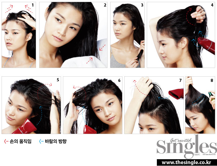 STEP 5 고개 기울여 모근 살리기 고개를 한쪽으로 기울인 채 모발을 반대편으로 넘긴다는 느낌으로 두피 쪽에 뜨거운 바람을 2~3초 가량 넣는다. 그 다음 시원한 바람을 같은 부위에 넣는다. 손가락을 갈고리처럼 펼쳐 두피 근처 모발을 잡고 위로 당겼다가 내리는 움직임에 주목.