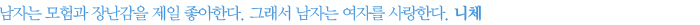 Re 대표적인 이유는 또 다른 승부를 하기 위해서다. 게임을 클리어했을 때, 프라 모델을 다 조립했을 때, 산 정상에 올라갔을 때처럼 또 다른 게임을 하고 싶은 것이다. 죽도록 여자를 따라 다녔는데 그 여자가 자기를 좋아하는 것 같으면 승리감에 젖어 더 이상 정복할 이유가 없어지 는 것이다. ‘산은 높을수록 맛이고 여자는 튕길수록 맛이다’라는 말이 괜히 있는 게 아니다. 그 래서 또 다른 여자를 찾으러 가는 것이다. 물론 이런 상황은 진심으로 사랑하는 것이 아니다. 만약 남자가 그 여자를 정말 좋아한다면 어제까지 다정하게 스킨십을 하다가 오늘 도망갈 수 는 없다. 김윤수