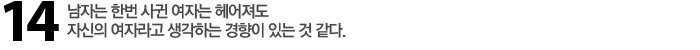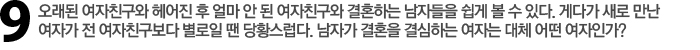 Re 오래 사귄 연인은 열정은 사라지고 편안함만 남아 있다. 오래 사귄 여자와 헤어지고 3개월 만에 다른 여자와 결혼을 하는 것은 이제 그런 경험을 한번 해봤으니 열정이 뜨거울 때 결혼해 버리자는 생각 때문이다. 여자가 생각하는 스펙은 자신만의 생각이다. 남자가 생각하는 여자의 스펙은 일대일의 관계에서 발생하는 상대적인 요소다. 윤용인