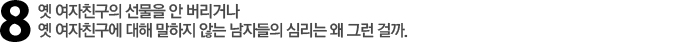 Re 옛 여자친구의 선물은 ‘전리품’ 같은 것이다. 자신감이 떨어졌을 때마다 보면서 자신감을 충전하는 것이다. 김윤수