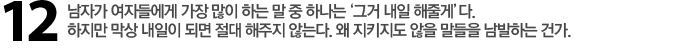Re 같이 지나다 줄이 긴 스파게티 집을 봤다고 치자. 여자는 “나, 스파게티 먹고 싶어. 저기 가자” 라고 말할 것이고, 그러면 남자들은 “내일 사줄게. 내일 가자”라고 말한 다. 이때 남자는 ‘분명 24시간 안에 마음이 변할 거야’라고 생각한다. 하지만 여자는 이 내일의 약속을 진짜 약속 리스트에 적는다. 남자들이 ‘내일 해줄게. 이번 달 안에 가자’라고 말하는 것은 절대 약속이 아니다. ‘되면 가고 아니면 말고’ 식이다. 이러한 일을 방지하려면 “지금 당장 예약하자!”고 말하면 된다. 시간과 날짜를 정해서 말이다. 윤용인