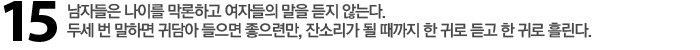 Re 남자들의 머릿속에 이미 ‘잔소리를 하는 여자’라는 인식이 박혀 있기 때문이다. 남자들에게 는 ‘너는 잔소리를 하는 여자, 나는 그것을 잘 들어주는 멋진 남자’라는 구조만 있다. 애초에 고 치겠다는 생각이 없다. 그러니 잔소리처럼 들리지 않게 해서 남자를 고쳐야겠다는 생각은 안 하는 게 현명하다. 방법은 오직 독하게 하는 것뿐이다. 가령, “너, 담배 안 끊으면 나랑 끝이야 !”라고 말해야 한다. 물론 너무 남발하면 효과가 없겠지만. 윤용인