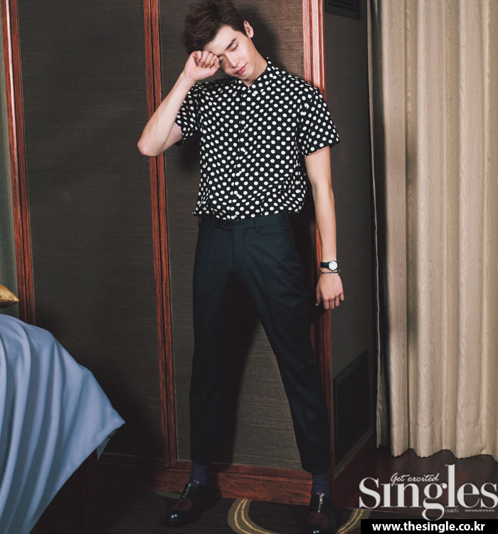 도트 프린트 반팔 셔츠는 쏘이 by 비이커, 블랙 슬랙스는 닐바렛, 러브 코드 브레이슬릿과 시계는 까르띠에, 양말은 아지오, 지퍼 장식 슈즈는 우영미.