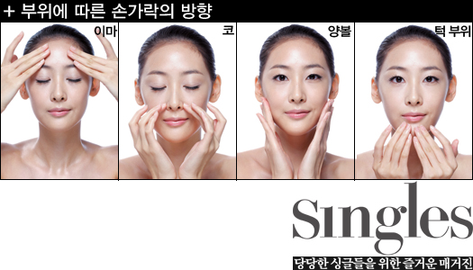 양볼 | 손가락 전체를 이용하여 위에서 아래 방향으로 피부를 끌어 올리는 듯한 느낌으로 원을 그리며 문지른다.