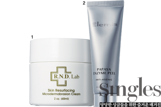 1 R.N.D. Lab 스킨 리썰피싱 마이크로덜마브레이션 크림 크림 타입의 부드러운 각질 제거 마사지 크림. 일정량을 덜어 얼굴 위에서 문지르며 핸들링한다. 60ml 7만5000원.
