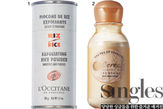 1 록시땅 엑스폴리에이팅 라이스 파우더 지성 피부에 효과 만점인 레드 라이스가 함유되어 있는 파우더 타입 각질 제거제. 물을 묻힌 뒤 얼굴 전체를 부드럽게 문지른다. 50g 2만9000원.