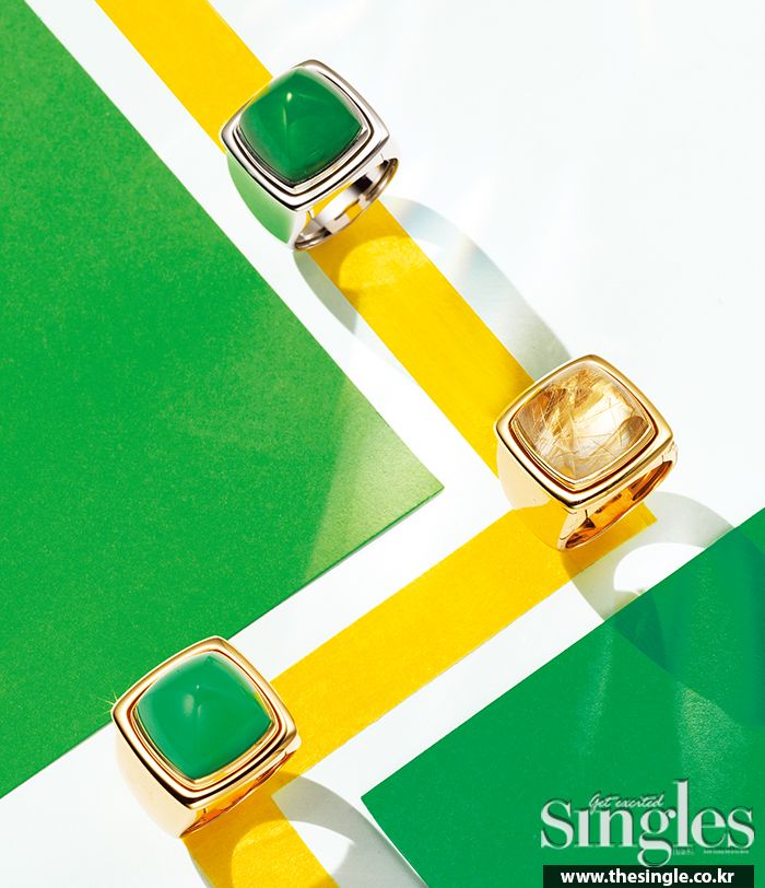 옐로 골드와 크리소프레이즈 카보숑 버전의 ‘빵 드 쉬크르 인터체인저블’ 링 프레드 가격미정.