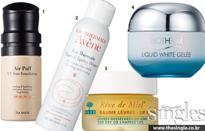 빠른 시간 내에 덧바르기 편해야 하고, 자외선 차단 지수도 넉넉해야 하는 데다, 열 받은 피부 온도를 낮추는 데도 좋은 제품군이 최고다. 기존에는 SPF 지수가 있는 쿠션 파데가 대세였다면 이제는 ‘쿨링’ 기능까지 갖춘 제품을 찾는다는 증언. 1 이자녹스 에어퍼프 UV 선 파운데이션 120ml 5만5000원.