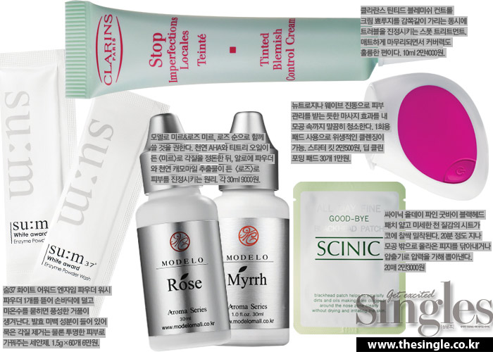 뾰루지를 막고 있는 블랙헤드를 불려 면봉으로 싹 닦아낸다. 얹어놓으면 피지가 불어 모공 밖으로 나오게끔 하는 마스크들이 있어 간편. 무엇보다 가장 확실한 방법은 압출기다. 압출기는 반드시 팁을 알코올로 소독한 뒤 쓰고, 오일프리 로션으로 마무리해 피부에 수딩 기능을 부여한다.