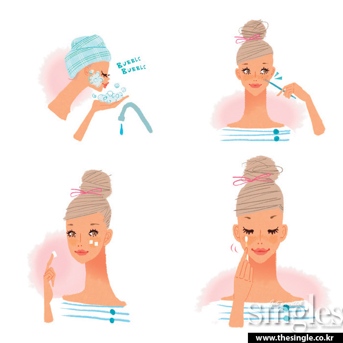 AHA와 BHA가 들어 있어 각질을 정돈하는 토너를 화장솜에 흥건히 적셔 얼굴 안쪽에서 바깥쪽으로 닦아내듯이 바른다. BHA 클렌저로 채 탈락되지 못한 피부 각질을 없애 건강한 피부가 표면으로 나오게끔 하는 것. 다음에는 항염 기능이 있는 수분 에센스로 자극이 가해진 피부를 진정시킨다.