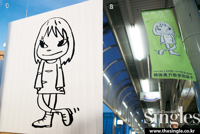 1 토와다시 현대미술관 한쪽 벽면에 그려져 있는 소녀. 옥상에 올라가면 잘 보인다. 2 토와다 시내는 전시회를 알리는 현수막이 가득했다.