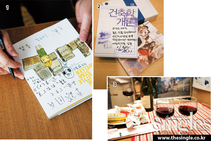 1 나라 요시토모가 이용주 감독에게 남긴 메시지. 오타를 즉석에서 그림으로 변신시켰다. 2 이용주 감독이 선물한 <건축학개론> DVD. 나라 요시토모는 콘티북이 인상적이라고 말했다. 3 지하 창고에서 꺼내온 와인.