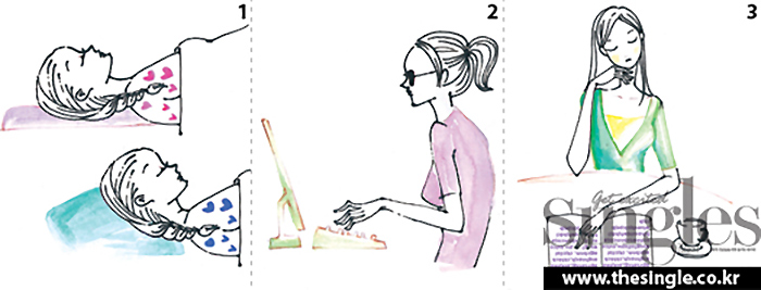 1 높은 베개를 베고 잔다 높은 베개는 얼굴과 목 라인의 각도가 커지면서 턱살이 중력에 의해 더 늘어진다.