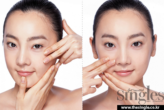 한 번에 한쪽 볼을 중지와 약지로 두 손을 번갈아가며 마사지한다. 턱과 광대뼈 사이의 볼 근육을 위쪽으로 잡아당기듯 리프팅 동작을 취한다. 매일 아침에 3회, 저녁에 5회를 반복하면 효과적이다.