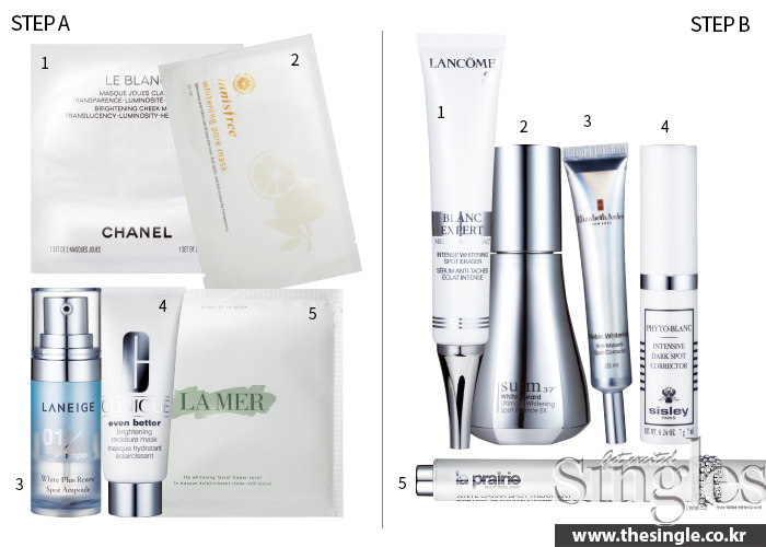 스킨케어에 있어 수분을 간과하는 건 낫 놓고 기역자도 모르는 것과 같다. 화이트닝 케어에 있어서는 더욱 그러한데, 특히 톤업 피부를 갈망한다면 8할 이상이 수분 공급에 달려 있음을 기억하라. 수분감이 풍부하면서 화이트닝 효과까지 제대로 전달하는 아이템으로는 시트 마스크만한 게 없다. 붙이는 순간 극강의 수분감을 피부 깊숙이 전달하면서 제품이 지닌 유효 성분의 효과에 불을 붙인다. 앰풀 또한 고농축 효과로 피부 컨디션을 끌어올리고 집중적인 관리를 하는 제품이므로 일주일에 한두 번 사용하기에 제격이다. 단, 사용 전 피부 표면의 각질 정리만큼은 염두에 두자. 아무리 공들인 케어라 할지라도 피부 위에 각질이 수북이 쌓여 있다면 무용지물이다. 특히 피부 침투력이 가장 떨어지는 성분의 집합체인 화이트닝 제품에 있어서는 거의 필수에 가깝다.