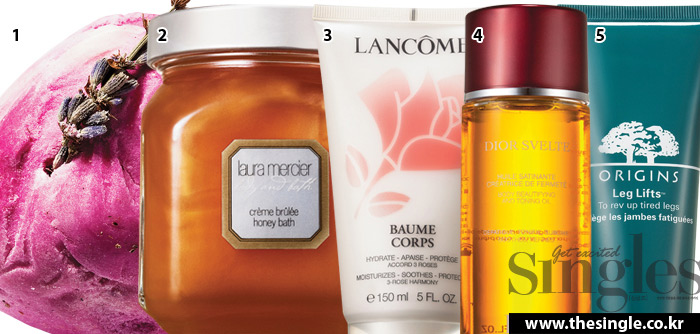 1 러쉬 프렌치 키스 100g 1만1300원. 2 로라 메르시에 허니 바스 300g 5만8000원. 3 랑콤 라 로즈 바디 밤 150ml 4만8000원. 4 디올 스벨트 바디 뷰티파잉 앤드 토닝 오일 100ml 6만원. 5 오리진스 레그 리프트 150ml 3만5000원.