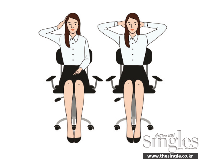 1 양손으로 의자 손잡이를 잡아 몸을 의지하고 상체를 뒤로 살짝 젖힌다.