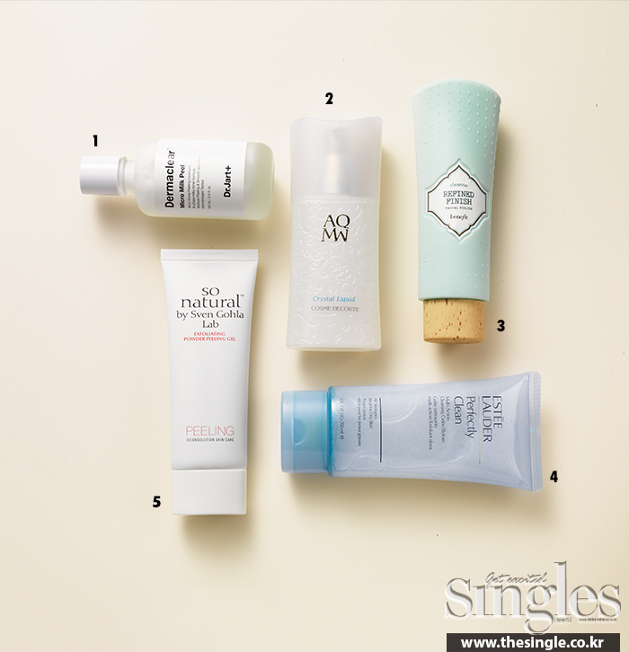모공 정돈을 위한 본격적인 피부 컨디션 조절에 들어가기 전, 피부 표면의 각질과 모공 속의 노폐물을 말끔하게 제거하자. 눈가나 입가에 미세하게 잡히는 주름이 신경 쓰이고 건조한 타입이라면 알갱이 없이 부드러운 플루이드 제형, 트러블이 고민인 피부라면 입자가 작은 알갱이를 포함한 겔 타입을 선택하면 된다. 모공 필링은 일주일 프로그램을 시작할 때, 한 번만 하면 충분하다.