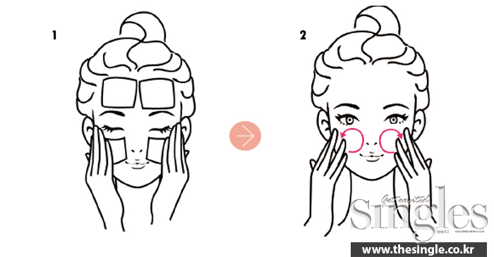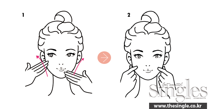 2 제품이 완전히 흡수되기 전, 턱부터 볼까지 튕기듯 꼬집어 모공에 긴장과 탄력을 더한다.