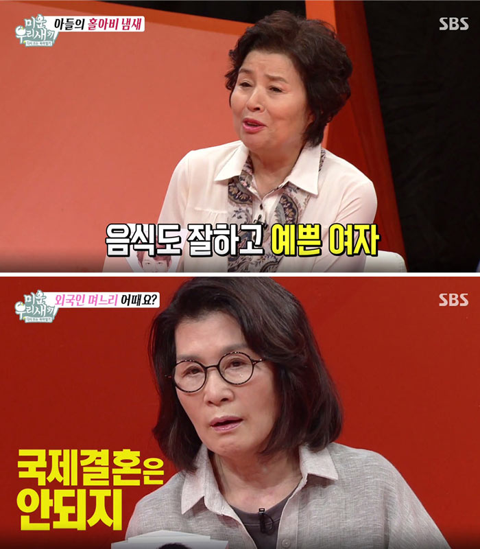 <미운 우리 새끼>는 스튜디오에 출연한 엄마들이 아들들의 일상을 미리 촬영한 영상으로 지켜보는, 일종의 ‘편집 CCTV’ 같은 포멧이다. 엄마들은 아들들의 행동에 당황하거나 부끄러워하고, 자기도 모르게 화를 냈다가 막상 남이 흉을 보면 갑자기 아들의 역성을 들고, “기승전-더 늦기 전에 결혼해야지”의 주장을 펼치다가도 여전히 타협의 여지 없이 확고한 ‘며느리론’을 피력한다. 국제결혼은 절대 안 되고, 기어이 국제결혼을 해야만 한다면 일본인 며느리 정도는 받아들일 수 있고, 클럽에서 만난 여자라니 으아니 그건 말도 안 되고, 며느리가 결혼 후엔 하던 일을 그만 두고 육아와 살림을 했으면 좋겠고, 음식도 잘 하고 예뻤으면 좋겠다. ‘이상적인 며느리’의 구체적인 모델도 있다. 이를 테면 “결혼하면 일을 접고 애를 셋 낳을 거예요”라고 방송에서 말한 적이 있다는 성유리(라고 김건모의 엄마 이선미 씨가 말했다). 내 아들 나이가 몇 살이든 며느리가 나이 많은 건 싫다. 이유는 “아이를 못 낳으니까”.