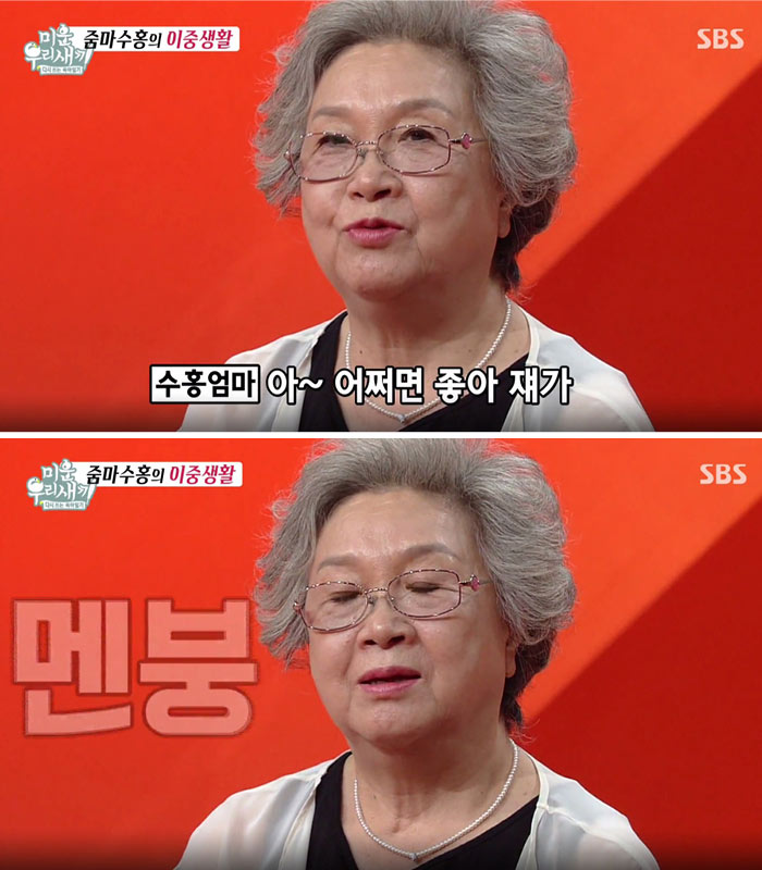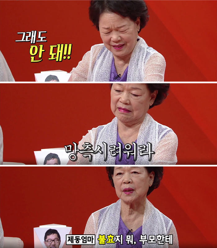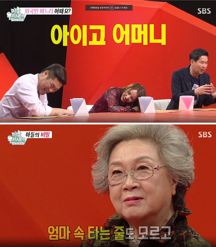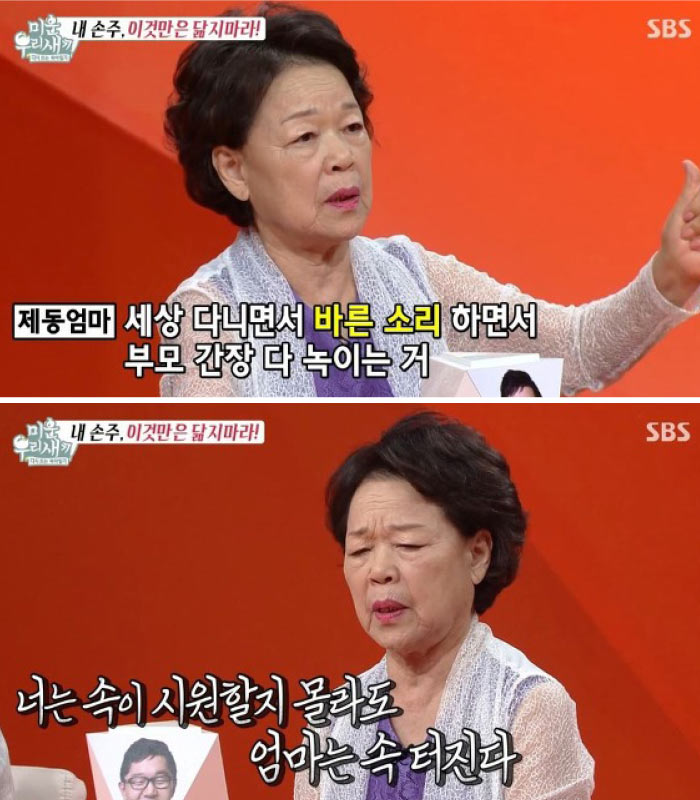엄마들은 <미운 우리 새끼>의 ‘재미 요소’(만약 그걸 재미있다고 느낀다면)이자 ‘갈등의 핵’이다. 지금까지 전혀 몰랐던 아들의 모습을 공개된 자리에서(“설마 이거 방송에 나가는 건가?”) 목격했을 때, 전문방송인도 아닌 60-70대의 ‘보통 사람’이 표정관리를 하는 건 애초에 불가능하다. 순진한 줄로만 알았던 아들이 클럽이라면 껌뻑 죽는다는 걸 처음 본 순간, 개그맨 박수홍의 엄마는 하늘이 무너진 동시에 지옥불처럼 화가 끓어오르는 표정이었다. 아들이 소주 전용 냉장고를 사들이는 걸 지켜보는 김건모의 엄마는 ‘눈빛으로 등짝 스매싱을 날린다면 아마 저런 거겠지’ 싶은 표정으로 화면을 노려보았다.