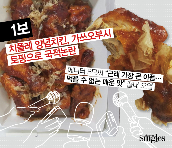 근래 내게 이런 아픔을 준 치킨은 네가 처음이야! 입안에 상처가 났다는 걸 깜빡 잊고 치킨을 한 입 씹었는데 다음 순간 나도 모르게 눈물을 흘리며 팝핀을 췄다. 깨작깨작 먹다 치킨이 식었는데, 매운 소스와 가쓰오부시가 섞이면서 역한 냄새가 난다.