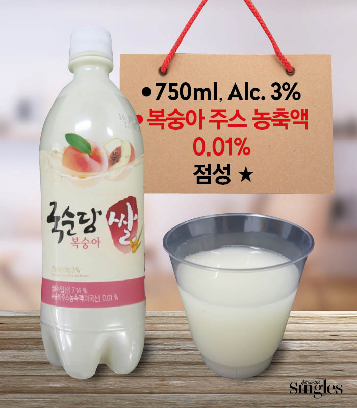 마시자마자 말이 없어진다. 이거 정말 뭐지? 마치 쥬시쿨 복숭아 맛에 소량의 소주를 섞어 놓은 것 같다. 애매모호한 이 막걸리는 맛에 큰 특징이 없다. 만약 ‘국순당 쌀 복숭아’를 동대문 ‘엽떡’에서 만났으면 어땠을까? 아마 신기한 마음에 마셔봤을 거다. 쥬시쿨이랑 크게 다르지 않으니. 그렇지만 단호하게 말할게. 안녕, 쌀 복숭아. 우리 인연은 여기까지인 것 같아.